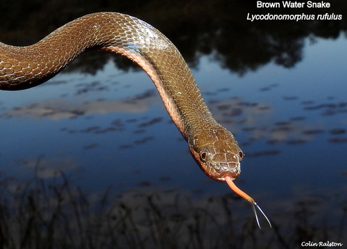 The Brown water snake can be identified by its uniform olive or light brown colouration, the pink or mother of pearl coloured underside, its good swimming ability and vertical pupils. It grows to an average length of 60 cm but may reach 85 cm. The distribution of this snake includes the entire western coast line and the north eastern half of South Africa and central Zimbabwe. Their preferred habitat includes rivers and in moist savanna and lowland forest.